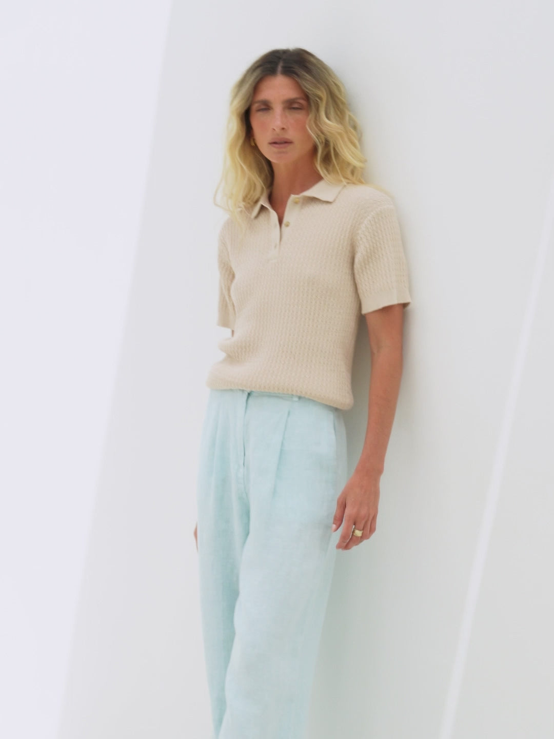 A textured classic in a versatile neutral. Made from a soft organic and recycled cotton knit, this polo feels light and easy for any season. The subtle white contrast trim at the sleeves and waist adds a fresh detail to the relaxed silhouette. It’s a simple, sustainable staple that pairs perfectly with your favorite linen trousers.
