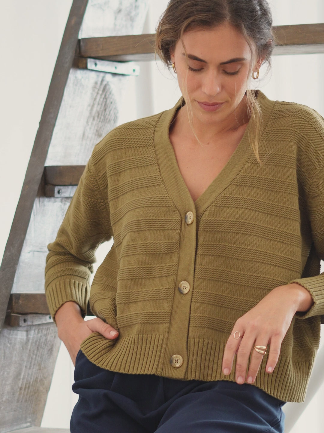 Designed to bring some texture to a wardrobe essential this cardigan features that boxy look that we love while looking elegant.
