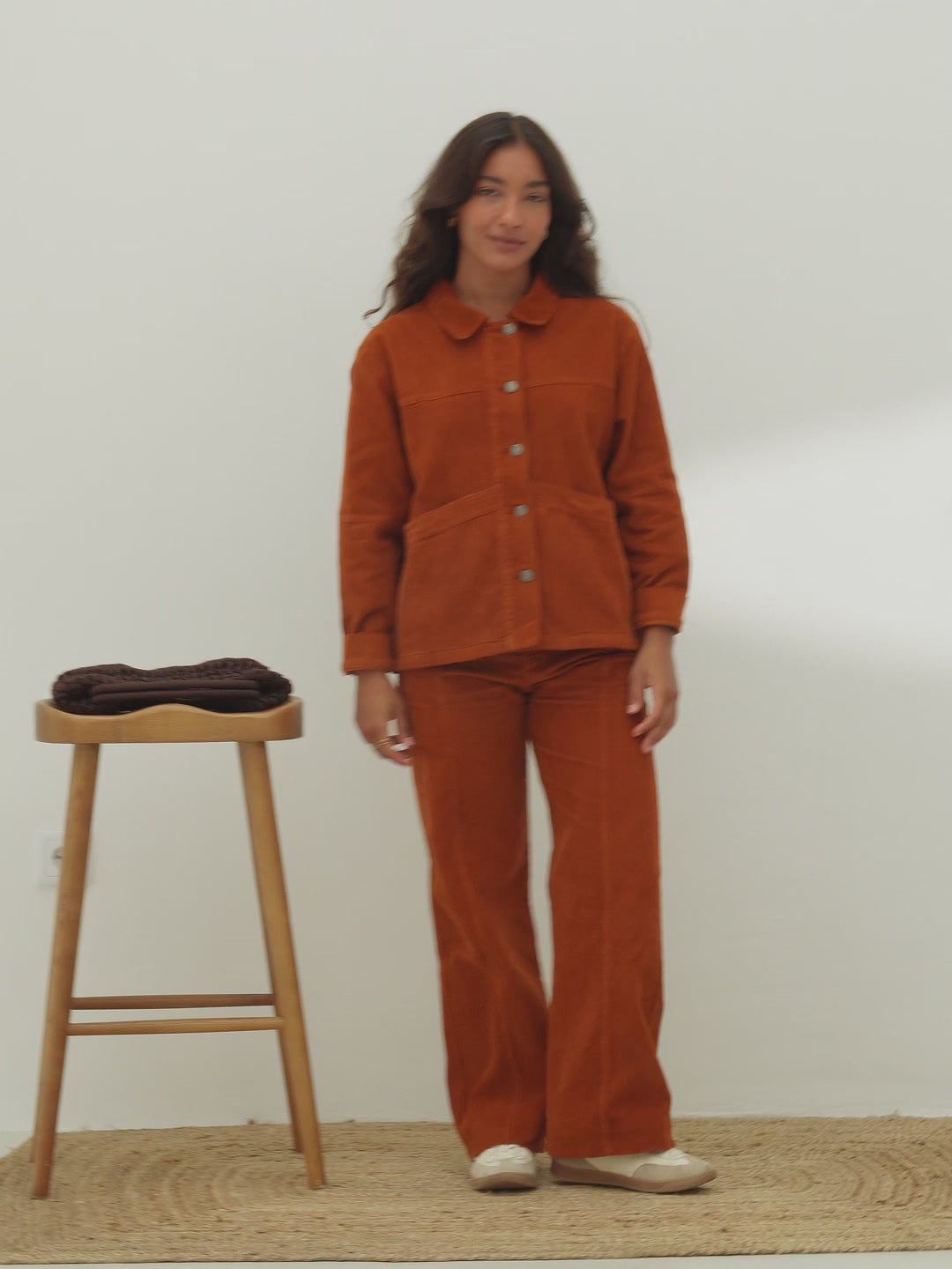 A comfortable oversized fit, huge pockets in a lovely organic micro corduroy fabric. In a deep orange color, it's the perfect shade to enter the Fall Season.